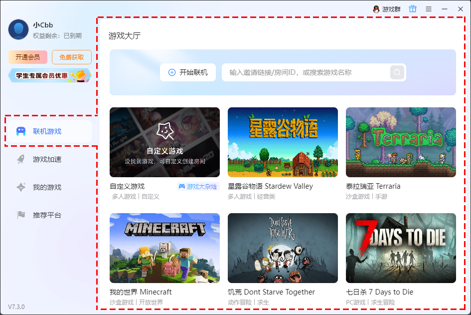 首页右上角显示当前登录的账号信息。未开通联机会员的账号显示当前游戏联机权益剩余时长;点击【免费获取】,可使用微信扫码关注微信小程序做任务获取及累积游戏联机权益时长;也可以点击【开通会员】,快速畅享游戏联机服务。