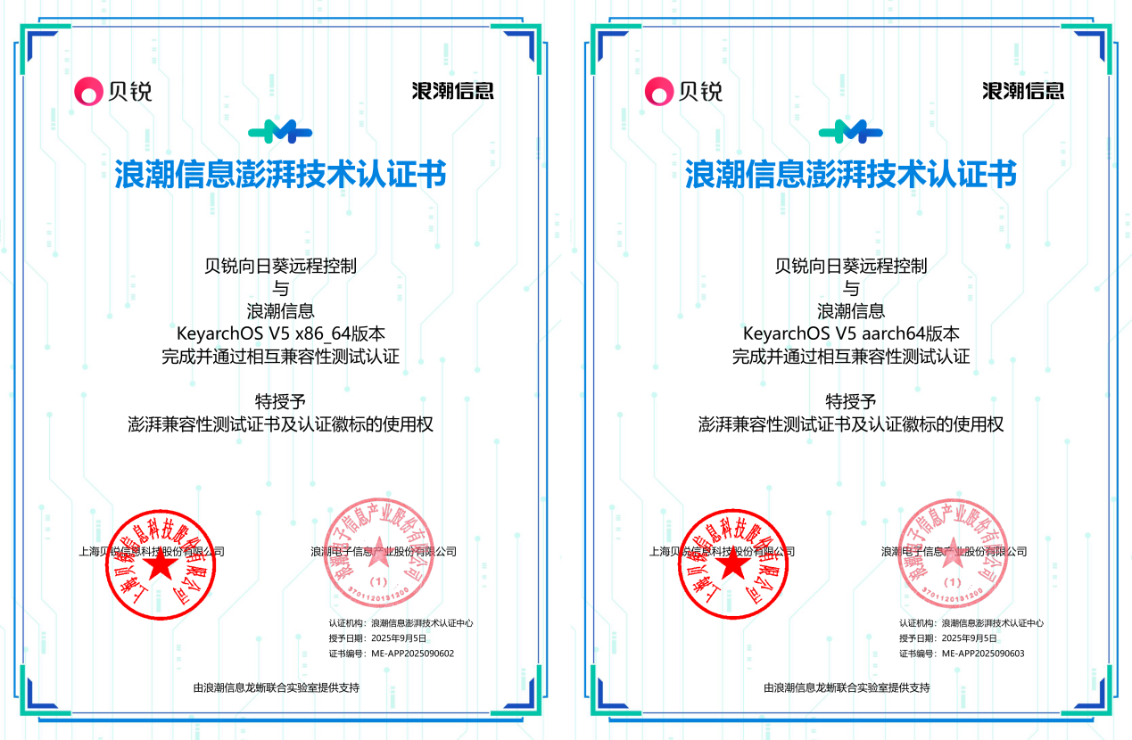 今年9月,国产远程控制领军品牌贝锐向日葵的向日葵企业版软件正式通过了浪潮旗下的云峦服务器操作系统KeyarchOS(简称”浪潮云峦KOS”)的相互兼容性测试认证(包括AArch64架构和x86_64架构),有效丰富了信创系统生态,为国产服务器设备的运维工具链提供了一项可靠的远程工具,并且解决了信创服务器远程运维的诸多痛点。