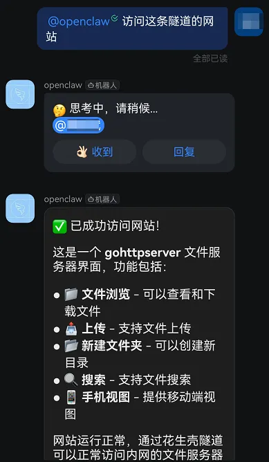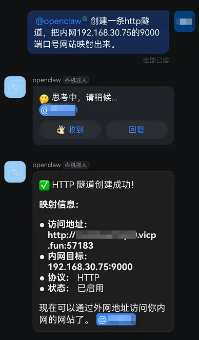 收到指令后,OpenClaw就能自动创建对应的内网映射。