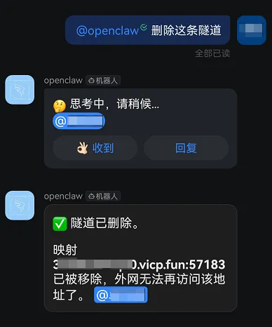 在涉及内网访问的场景中,安全始终是重中之重。任务执行完成后,你还可以命令OpenClaw自动删除隧道,做到“随用随开、用完即关”,避免留下多余暴露面,让整个过程更安全、更可控。