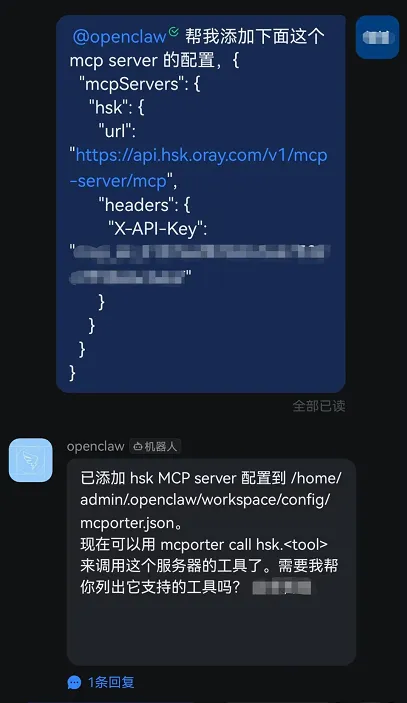 完成配置也非常简单。你只需要在对话框中,将花生壳 MCP的配置JSON发送给OpenClaw,它就能自动完成接入。