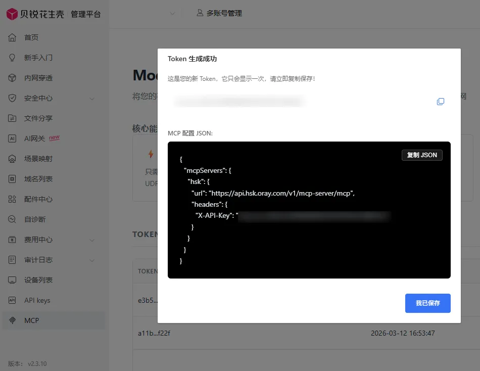 在这里,你可以一键生成MCP配置JSON。复制这段配置,它就是OpenClaw与花生壳建立连接的关键凭证。