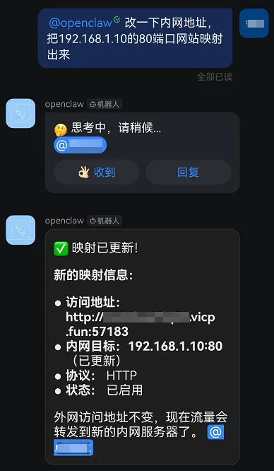 如果需求发生变化,也无需手动重新登录后台操作。你只需要告诉OpenClaw更换新的内网地址或端口,它就能自动更新映射目标,整个过程依然保持高效流畅。