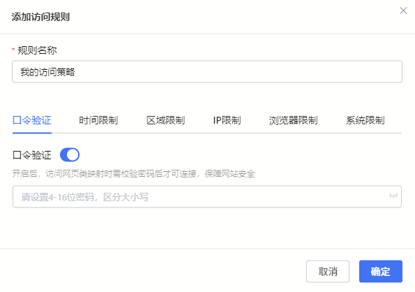 在“安全设备”中“新增规则”,并选择口令验证,为隧道配置访问口令。