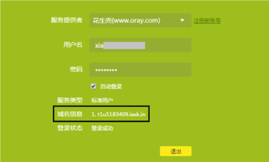 花生壳账号注册成功后,即可在路由器DDNS界面中输入花生壳账号和密码,点击 登录,登录成功后,在界面中会显示其对应的域名信息。
